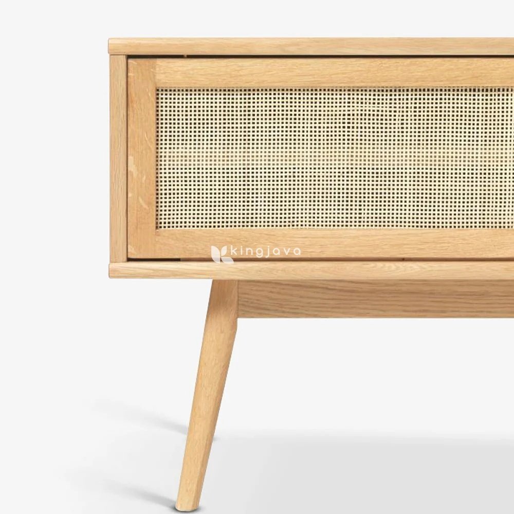 Material utama meja TV ini adalah kayu solid dengan finishing natural semi-glossy yang menonjolkan keindahan serat kayu alami. Pintu geser rotan menambah sentuhan tekstur yang unik dan memberikan kesan vintage yang elegan. Konstruksi meja ini kokoh dengan kaki-kaki meruncing yang memberikan stabilitas dan sentuhan retro.