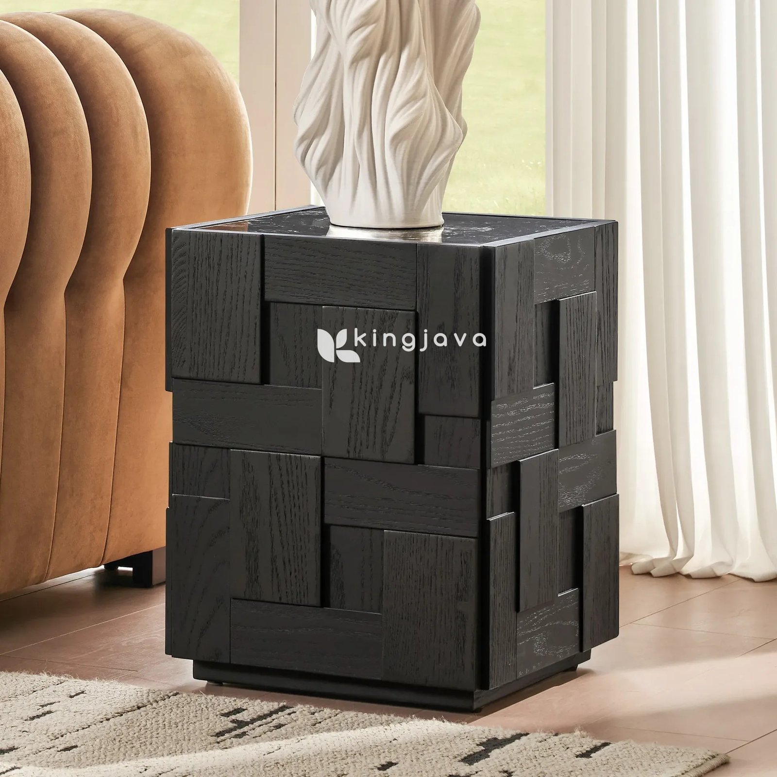 Nakas Kayu Solid Hitam Modern dengan Top Marmer – Bellatrix hadir dengan desain yang memukau untuk melengkapi kamar tidur Anda. Nakas ini menampilkan konstruksi kubus yang kokoh dengan pola geometris unik pada bagian depan, menciptakan tampilan modern dan artistik. Warna hitam solid memberikan kesan elegan dan mewah. Di sisi lain, top marmer dengan corak abstrak hitam putih menambah sentuhan mewah dan berkelas pada nakas ini. Dengan demikian, nakas ini ideal untuk menciptakan suasana kamar tidur yang nyaman dan stylish.