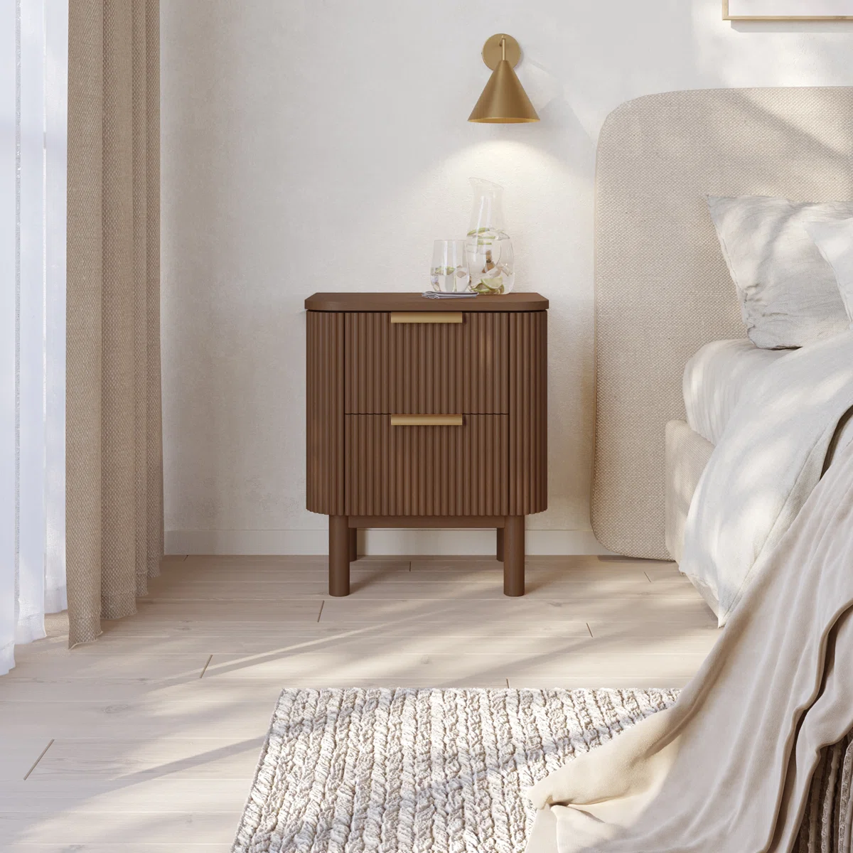 Ruang penyimpanan dua laci yang lega memudahkan Anda menyimpan berbagai barang pribadi di dekat tempat tidur. Dengan demikian, Anda dapat menyimpan buku, kacamata, remote control, dan barang-barang lainnya dengan rapi. Desain minimalis dilengkapi handle laci berwarna emas yang elegan. Selain itu, kaki-kaki nakas yang tinggi memberikan kesan ringan dan modern. Oleh karena itu, nakas ini sangat ideal untuk melengkapi kamar tidur Anda.