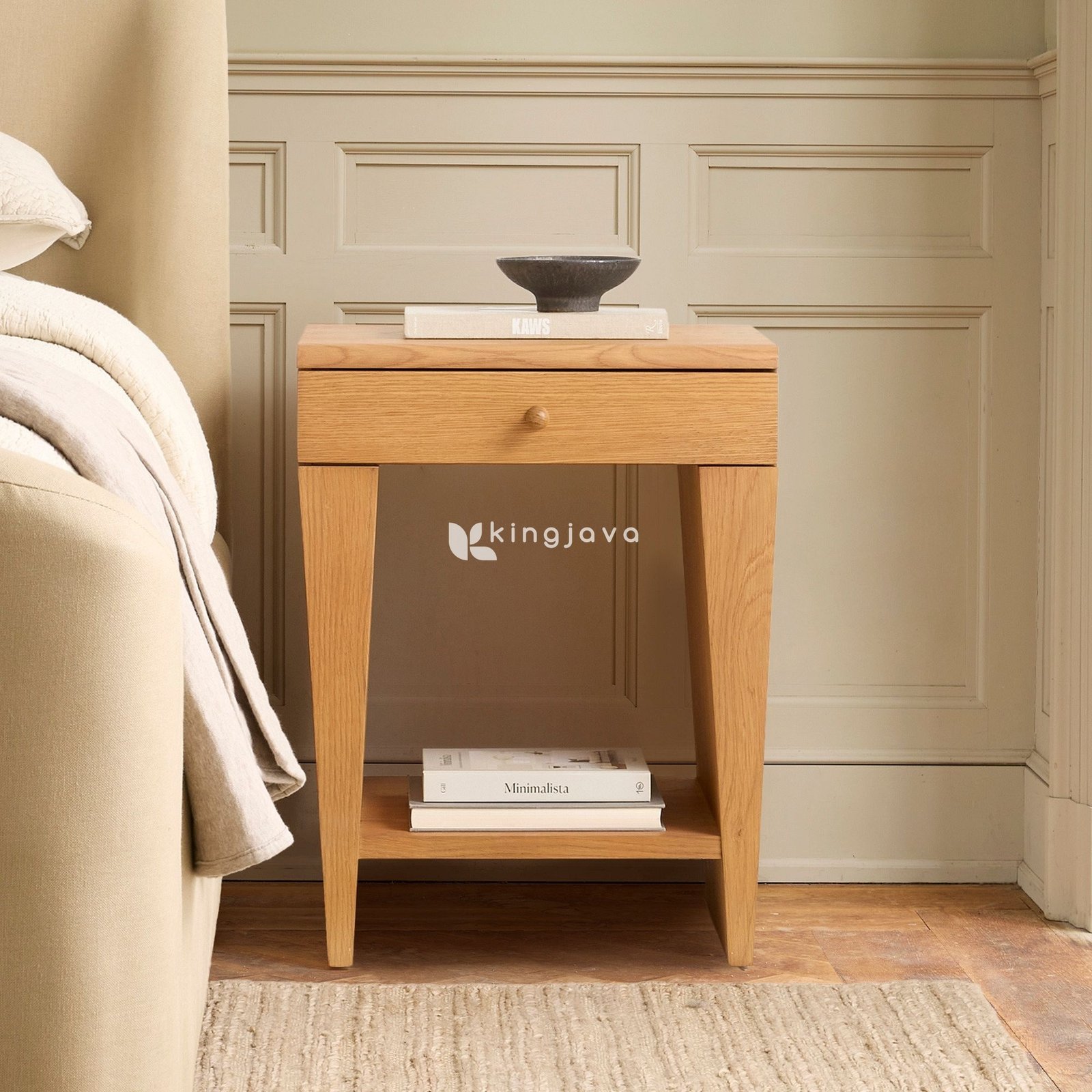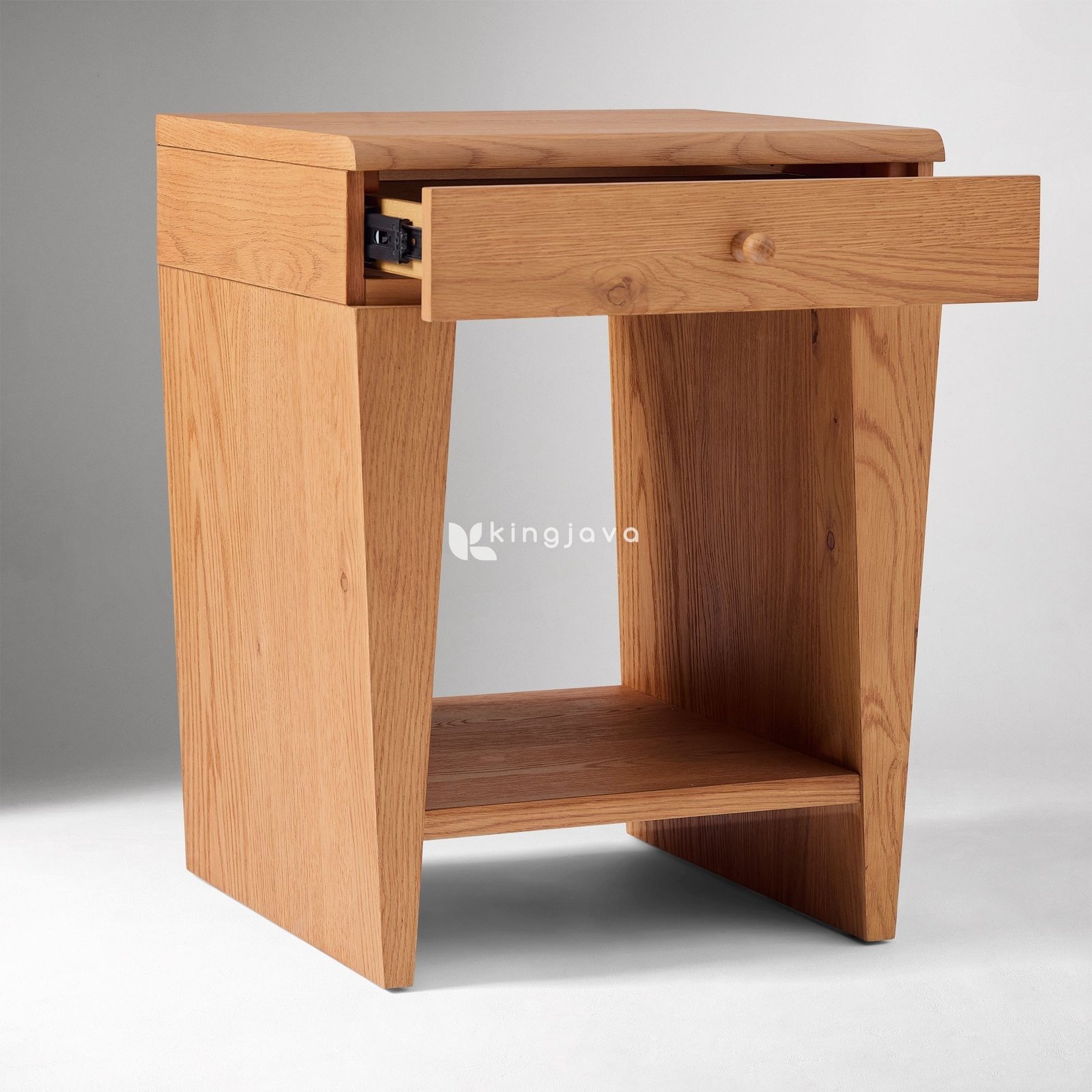 Konstruksi nakas ini sangat kokoh dan stabil berkat penggunaan kayu jati solid berkualitas tinggi. Sambungan-sambungan kayu dibuat dengan presisi tinggi untuk memastikan kekuatan dan daya tahan yang optimal. Kaki-kaki nakas didesain dengan bentuk trapesium yang unik, memberikan kesan ringan dan elegan.