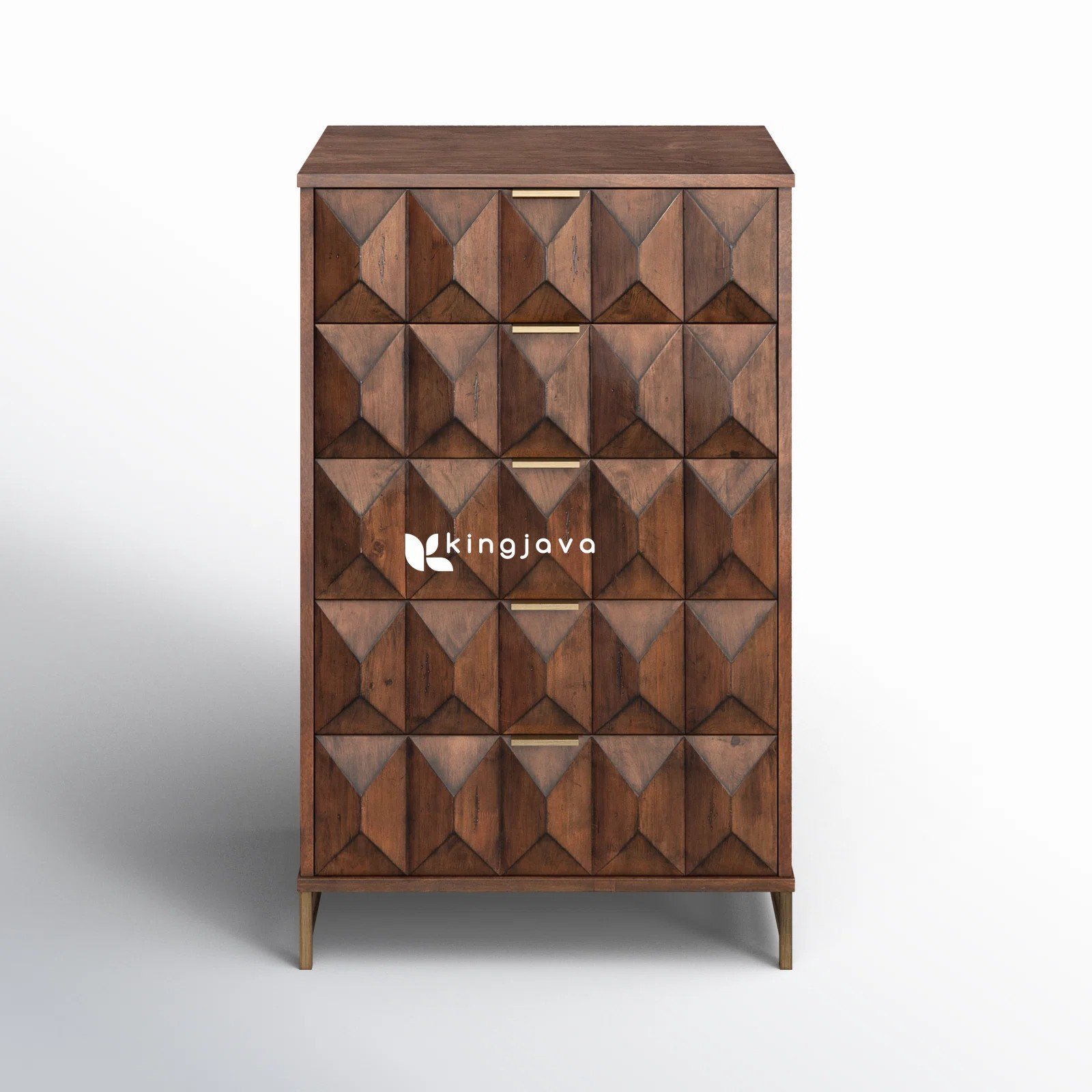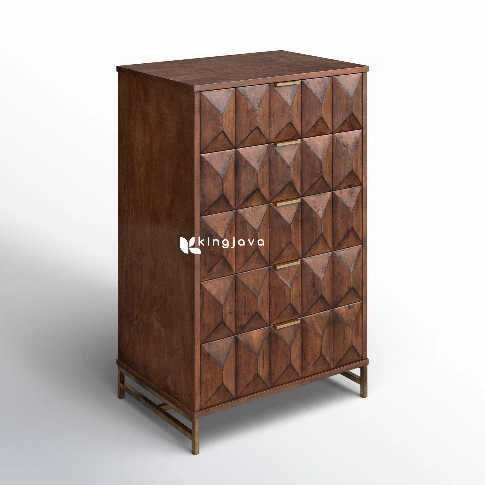 Nakas Laci Tinggi Kayu Mahoni Solid Modern Geometris dengan Kaki Besi Kuningan – Gala hadir dengan desain yang memukau untuk melengkapi interior hunian Anda. Perpaduan warna coklat tua yang hangat dari kayu solid dan aksen emas pada kaki serta handle menciptakan tampilan mewah yang tak lekang oleh waktu. Selain itu, pola ukiran 3D geometris pada setiap laci memberikan dimensi visual yang menarik, menjadikan nakas ini pusat perhatian di ruangan mana pun.