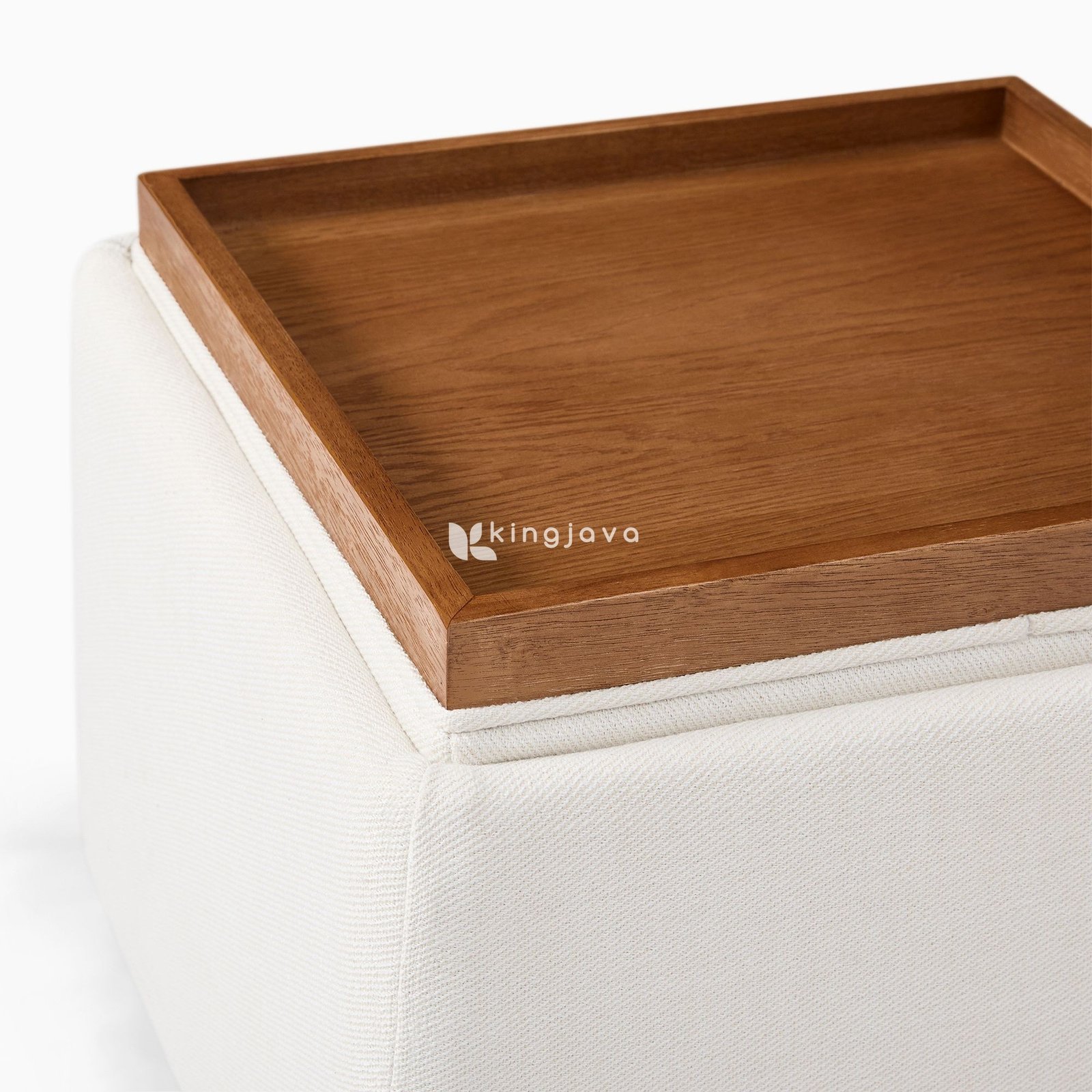 Bagian atas ottoman ini dilengkapi dengan tray kayu jati yang berfungsi ganda. Tray ini dapat digunakan sebagai permukaan yang stabil untuk meletakkan minuman, buku, atau dekorasi lainnya. Desain tray yang dapat dilepas juga memberikan fleksibilitas tambahan, memungkinkan ottoman untuk digunakan sebagai tempat duduk tambahan atau sandaran kaki yang nyaman. Detail konstruksi terlihat jelas pada sambungan kayu jati yang presisi, menampilkan keahlian tukang kayu yang terampil. Kaki-kaki ottoman yang pendek dan kokoh memberikan stabilitas dan keseimbangan yang optimal.