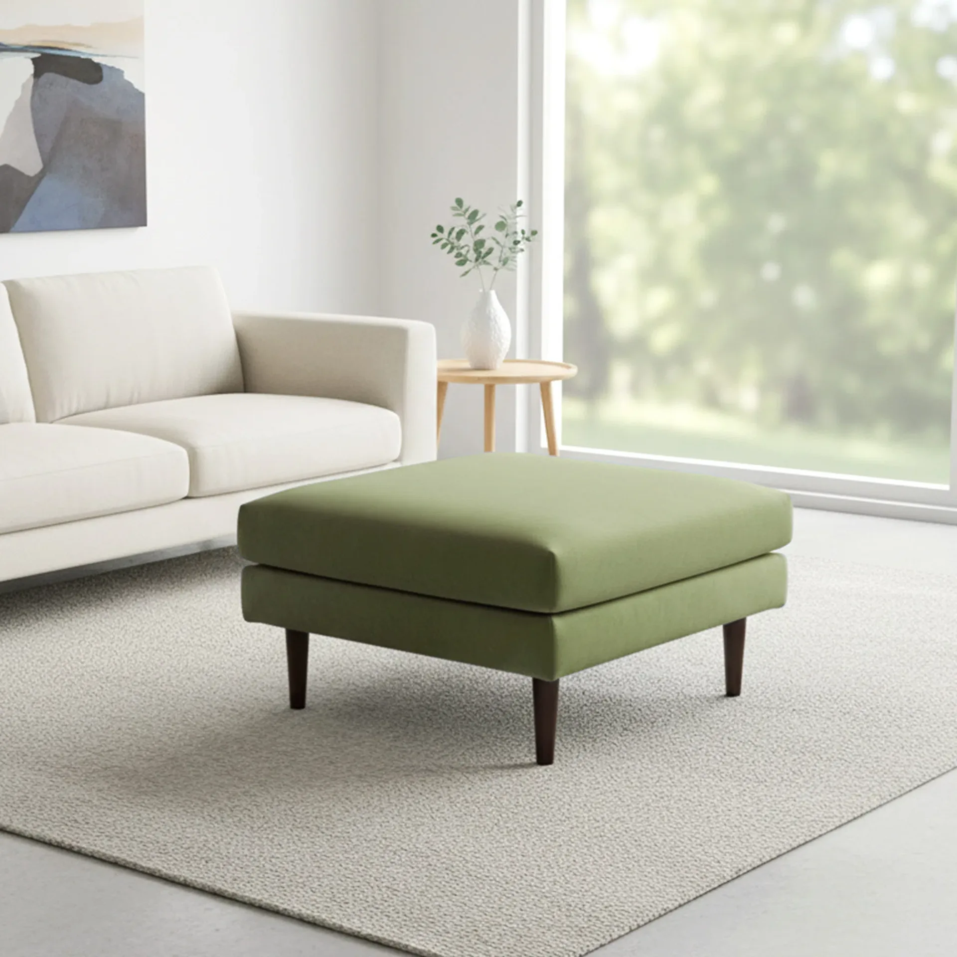 Ottoman Kayu Jati Velvet Modern – Hana adalah pilihan tepat bagi Anda yang mencari sentuhan elegan dan fungsional di ruang keluarga. Ottoman ini hadir dengan bentuk persegi yang simpel, dibalut kain velvet berwarna hijau zaitun yang mewah. Kaki-kaki ramping dari kayu jati memberikan kesan modern yang hangat. Di sisi lain, tekstur velvet yang lembut mengundang untuk bersantai.