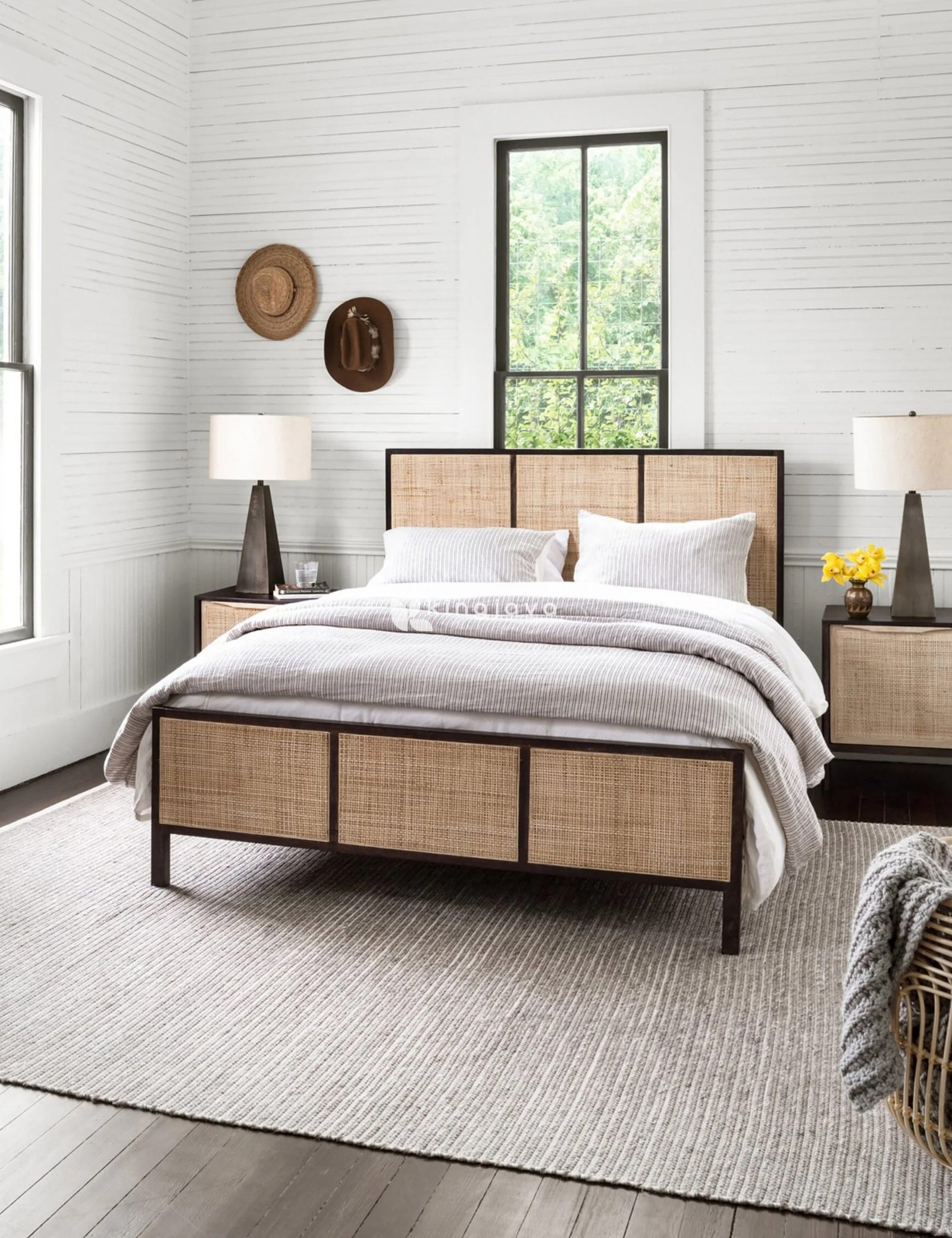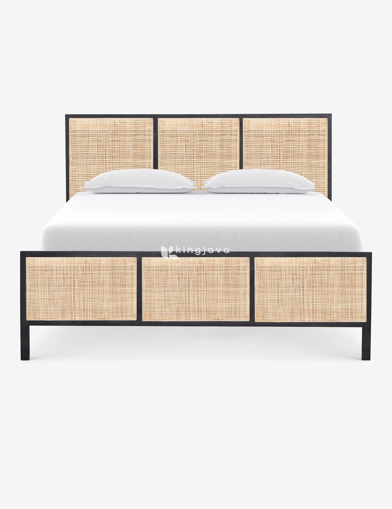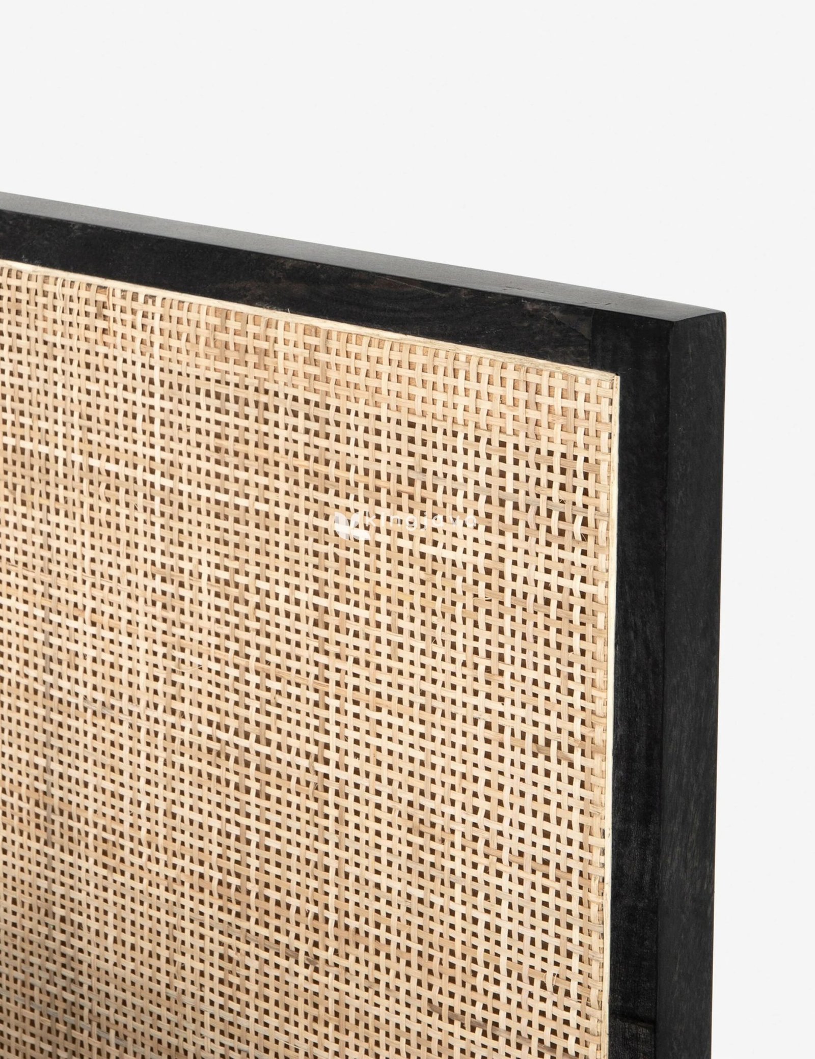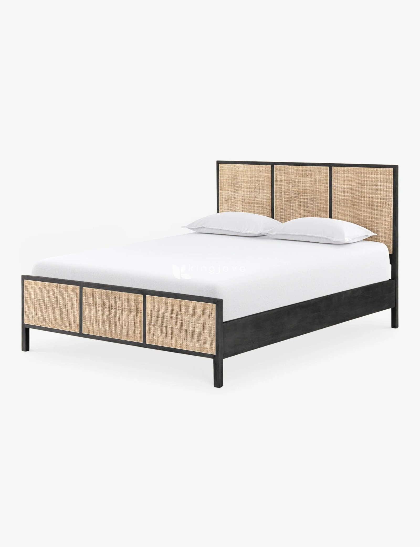 Rangka ranjang terbuat dari kayu jati solid yang kokoh dan tahan lama. Kayu jati dipilih karena kekuatan alaminya dan serat kayunya yang indah. Bagian kepala dan kaki ranjang diisi dengan anyaman rotan alami dalam pola geometris, menciptakan tekstur yang menarik dan memberikan sentuhan alami pada desain keseluruhan. Warna alami rotan memberikan kontras yang indah dengan rangka kayu jati yang dicat hitam.