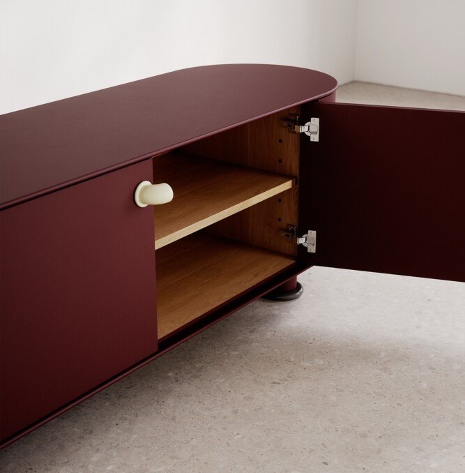 Sideboard Kayu Rekayasa & Solid Modern Minimalis dengan Handle Bulat Ganda – Freya adalah perpaduan sempurna antara fungsionalitas dan estetika kontemporer yang dirancang untuk memperkaya setiap ruang. Kabinet penyimpanan ini menampilkan desain yang ramping dan elegan, dengan bentuk persegi panjang memanjang yang diperhalus oleh sudut dan tepi yang membulat sempurna, memberikan kesan lembut dan modern. Eksterior Freya dibalut dalam warna merah maroon yang kaya dan mendalam, dengan finishing matte lacquer yang halus dan mewah, menciptakan tampilan premium yang tidak memantulkan cahaya berlebih dan terasa lembut saat disentuh.