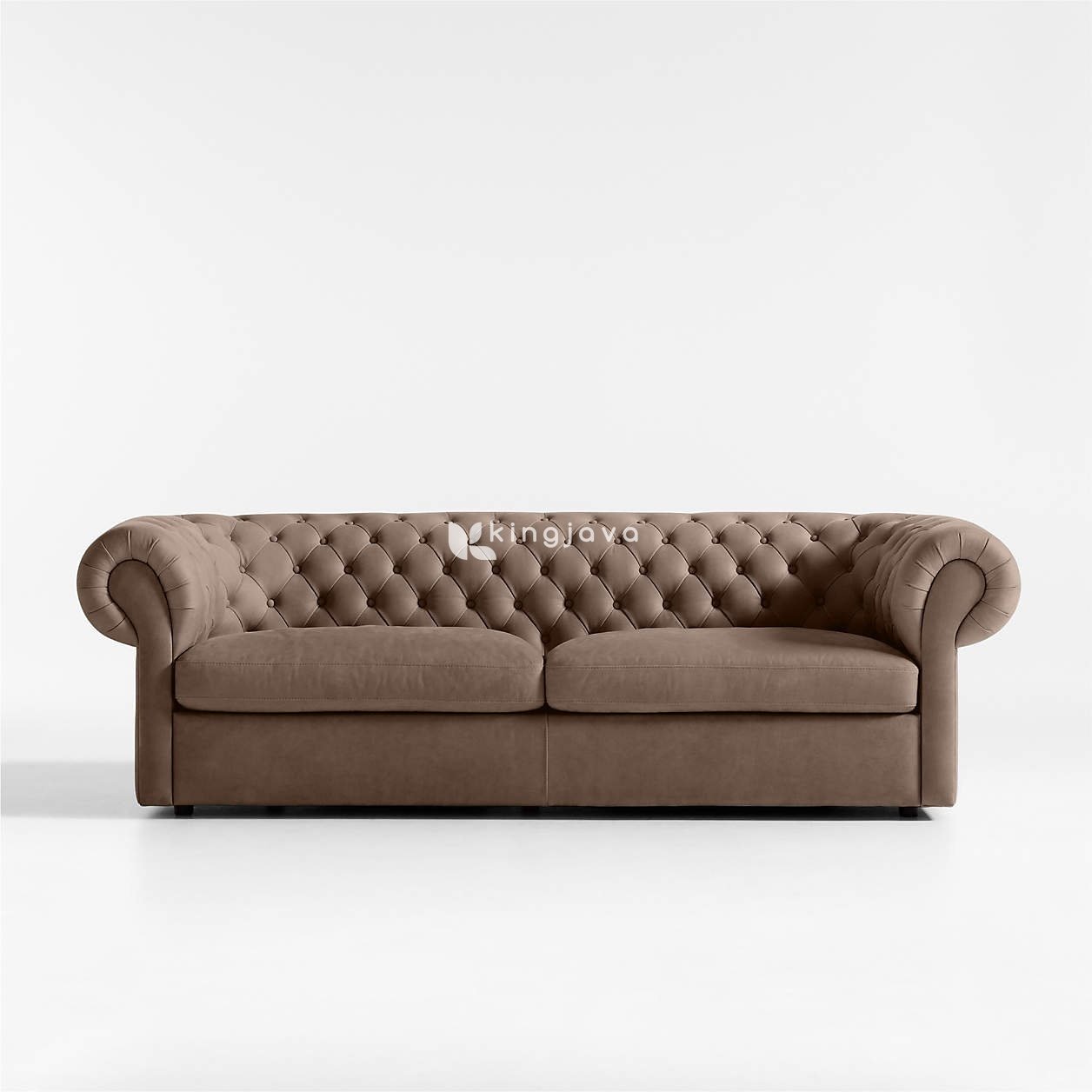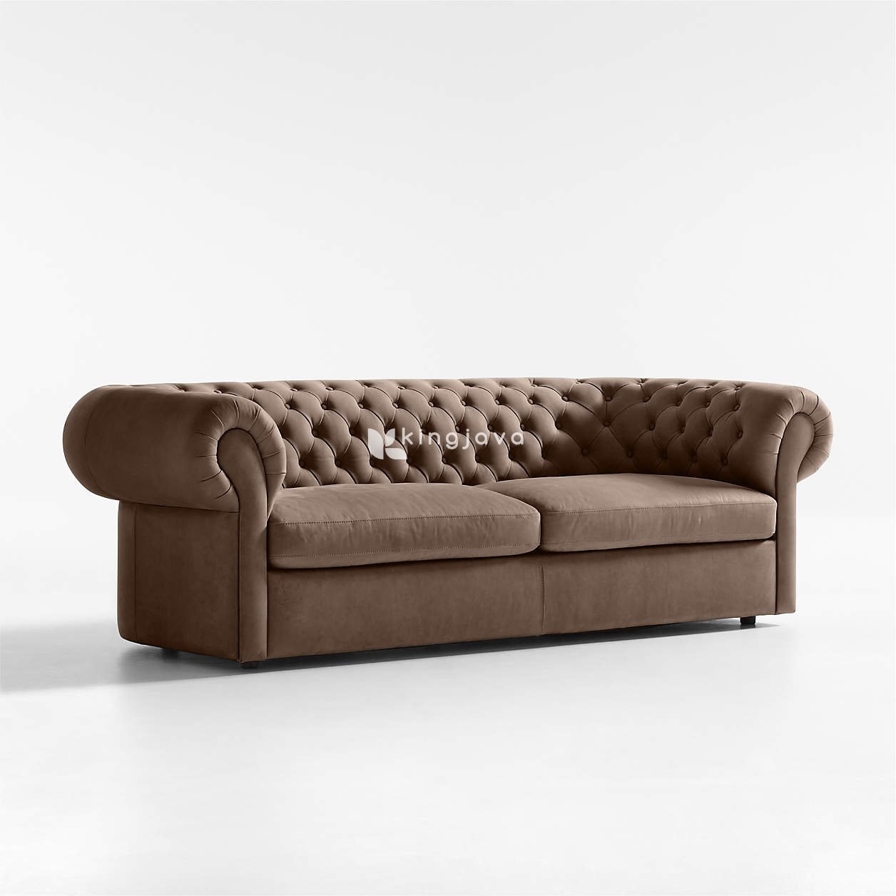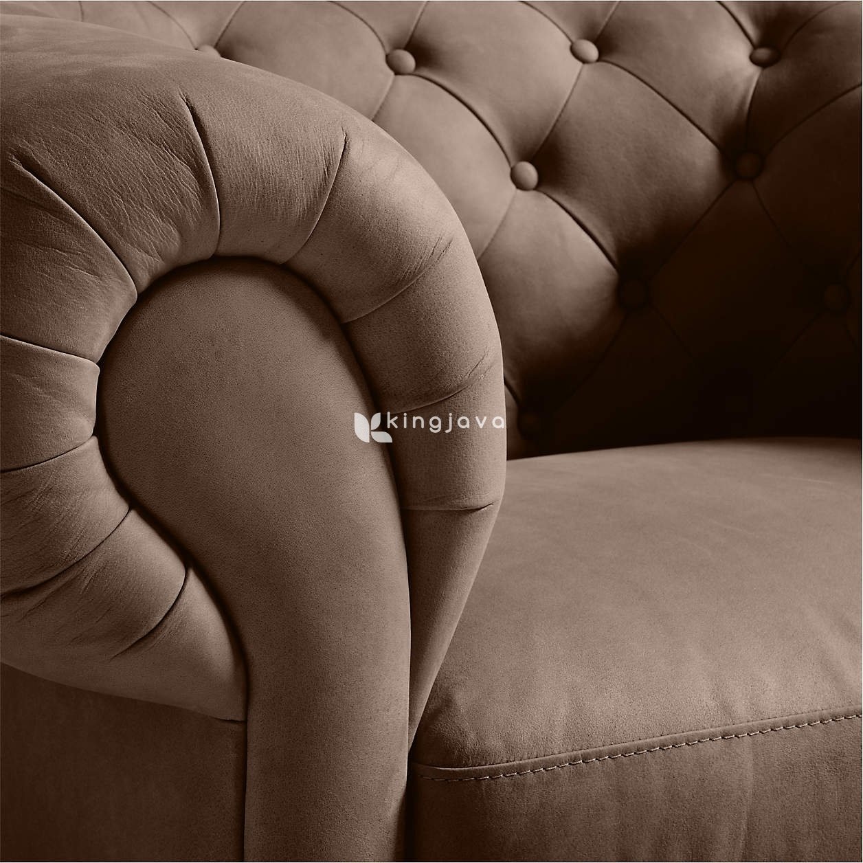 Sofa Chesterfield Velvet Gaya Klasik Tufted – Aurelian adalah perwujudan kemewahan klasik yang tak lekang oleh waktu. Dengan desain Chesterfield yang ikonik, sofa ini menampilkan siluet elegan dengan sandaran dan lengan yang digulung indah, dipercantik dengan detail tufting kancing yang mendalam. Bentuknya yang kokoh dan proporsional memberikan kesan mewah dan nyaman, mengundang Anda untuk bersantai dan menikmati momen-momen istimewa.