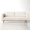 Material utama sofa ini adalah kain tenun berwarna krem muda yang memberikan kesan lembut dan nyaman saat disentuh. Kain ini membungkus seluruh bagian sofa, termasuk sandaran, dudukan, dan lengan sofa. Rangka sofa terbuat dari kayu solid dengan finishing semi-glossy natural, menonjolkan serat alami kayu yang indah. Kaki-kaki sofa yang ramping dan meruncing menambah kesan ringan dan elegan pada keseluruhan desain.