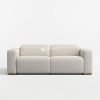 Sofa Donovan ini dibalut dengan kain bertekstur halus berwarna krem yang memberikan kesan hangat dan mengundang. Tekstur kain yang terlihat jelas menambah dimensi visual pada desainnya. Bagian kaki sofa terbuat dari kayu dengan finishing semi-glossy natural yang memberikan sentuhan alami dan kontras yang halus dengan warna kain.