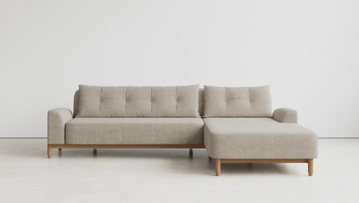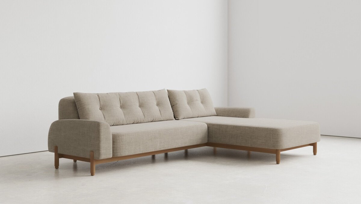 Sofa Sectional L-Shape Kain Linen Blend Skandinavia Modern Tufted Backrest Chaise Lounge – Lucia adalah perwujudan sempurna dari kenyamanan dan gaya kontemporer yang dirancang untuk memperkaya ruang tamu Anda. Desain L-shape yang elegan ini menawarkan konfigurasi yang luas, ideal untuk bersantai atau menjamu tamu, dengan tambahan *chaise lounge* yang nyaman di sisi kanan (saat dilihat dari depan) untuk relaksasi maksimal. Seluruh permukaan sofa dilapisi dengan kain linen blend berkualitas tinggi berwarna *beige oatmeal* yang menawan, memberikan tekstur tenun yang kaya dan sentuhan lembut yang mengundang. Warna netral ini memastikan fleksibilitas dalam penataan interior, mudah dipadukan dengan berbagai palet warna dan gaya dekorasi.