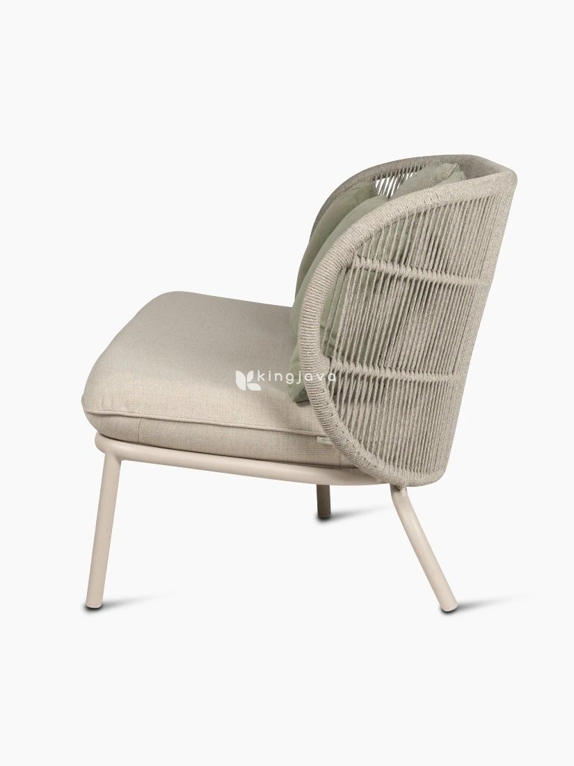 Warna keseluruhan sofa ini adalah krem lembut, memberikan kesan hangat dan netral yang mudah dipadukan dengan berbagai dekorasi outdoor. Bantal duduk yang empuk dilapisi kain berwarna senada dengan tekstur halus, menambah kenyamanan saat bersantai. Tiga buah bantal sandaran berwarna hijau olive memberikan sentuhan warna yang segar dan alami.