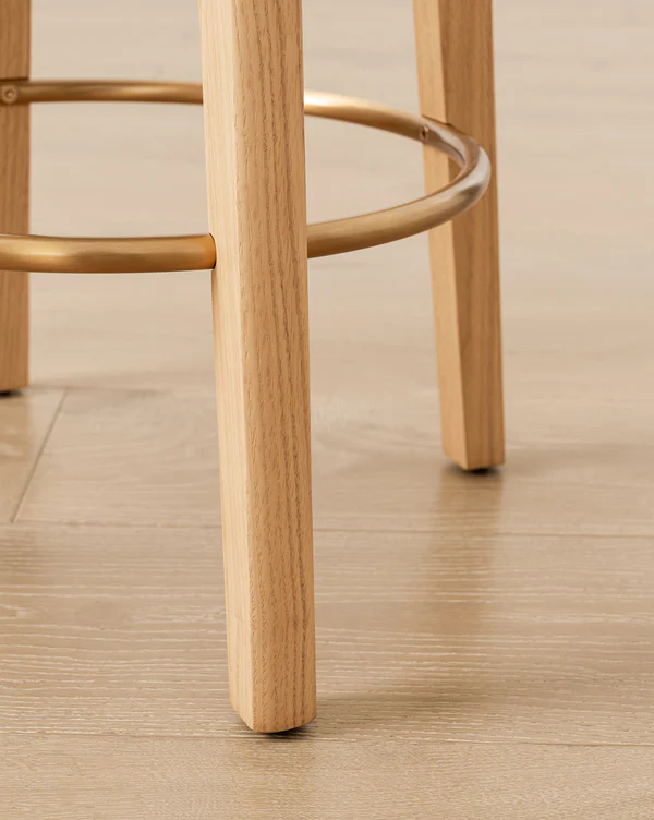 Stool Bar Kayu Jati Minimalis Modern Dudukan Kulit – Marquis hadir dengan desain yang memukau untuk melengkapi area dapur atau bar Anda. Stool bar ini menampilkan rangka kayu jati berwarna natural, dudukan bundar empuk berlapis kulit coklat, dan sandaran kaki logam berwarna emas yang elegan. Selain itu, bentuknya yang ramping dan minimalis memancarkan aura kehangatan serta kemewahan. Dengan demikian, ini menjadikannya pilihan ideal untuk ruang dapur modern, area bar, atau kafe bergaya kontemporer.