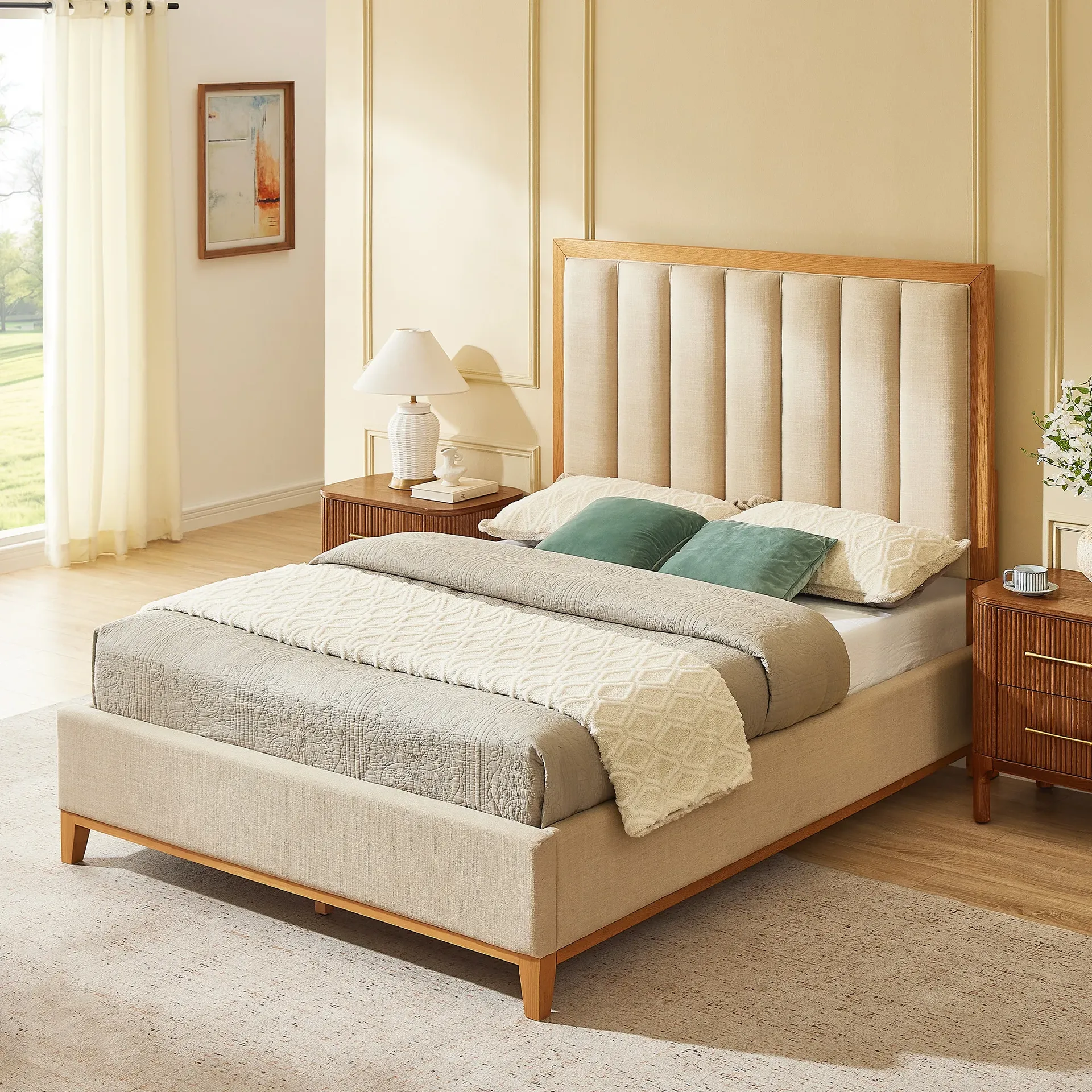Tempat Tidur Kain Linen Minimalis Modern dengan Headboard Bergaris – Chromite hadir dengan desain yang memukau untuk menciptakan kamar tidur impian Anda. Tampil dengan warna krem yang lembut dan menenangkan, tempat tidur ini menawarkan headboard bergaris vertikal yang elegan. Selain itu, rangka kayu yang kokoh memberikan kesan minimalis modern yang sempurna. Dengan demikian, kamar tidur Anda akan terasa lebih nyaman dan stylish.