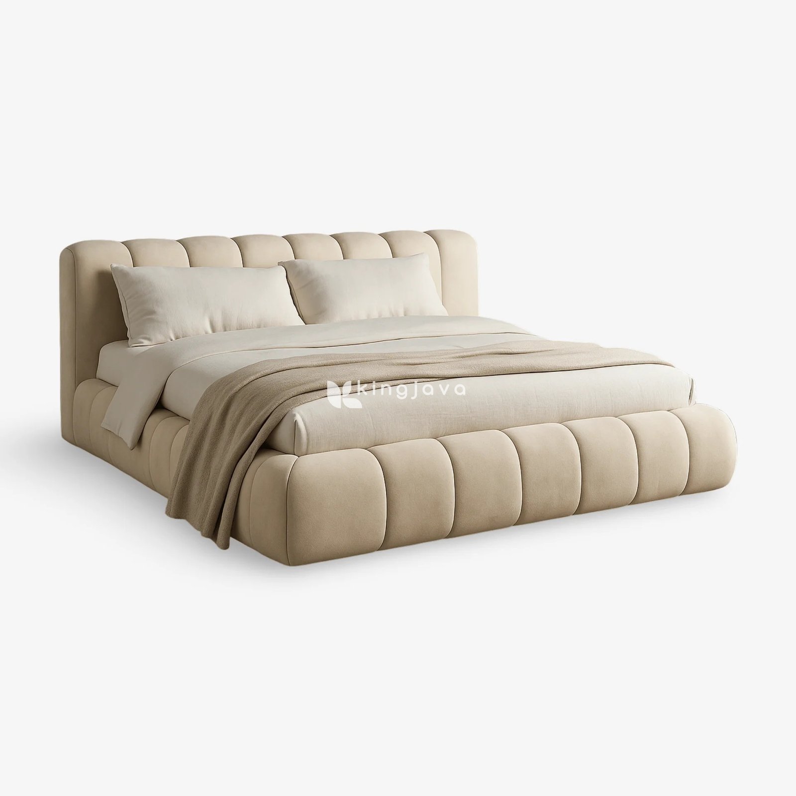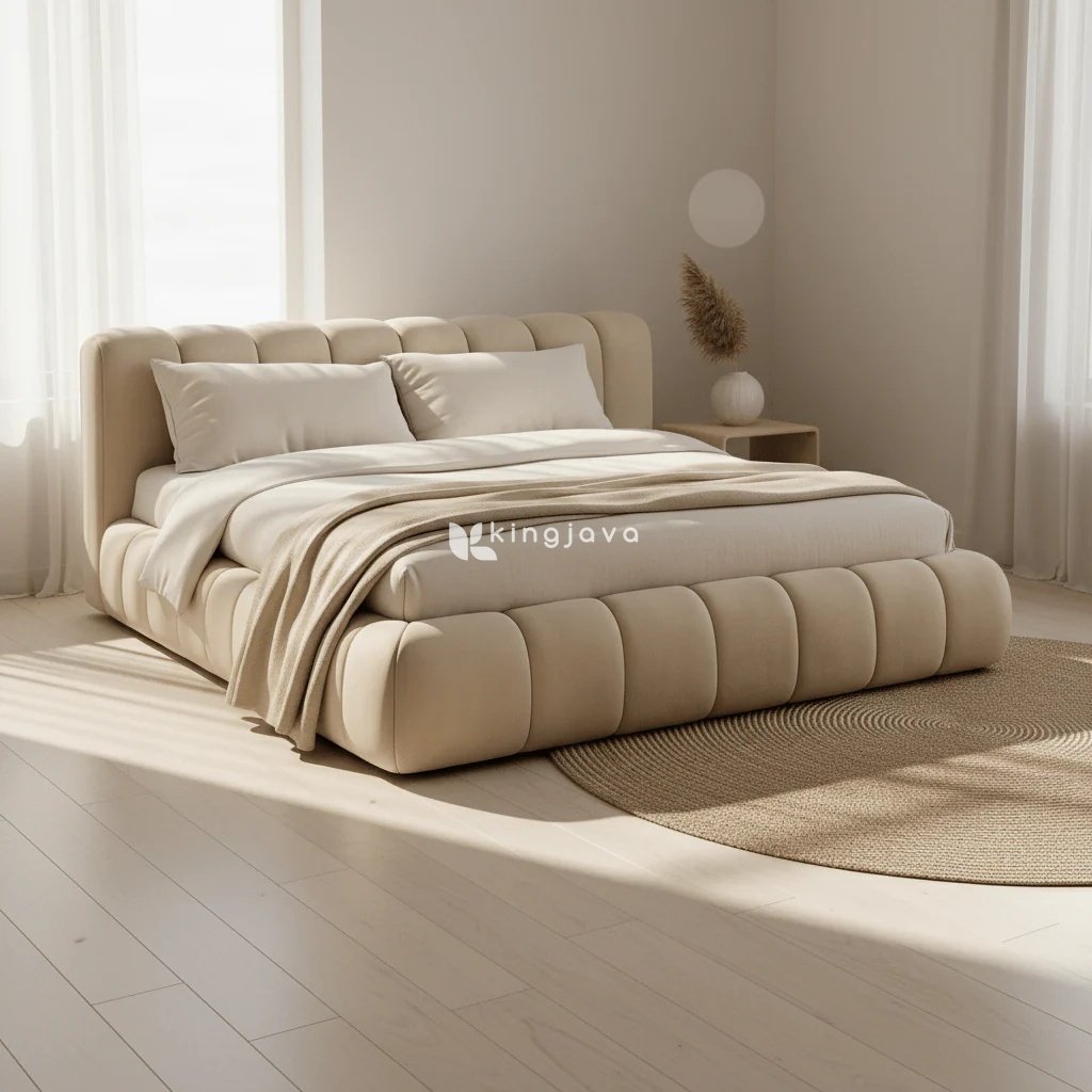 Tempat Tidur Kain Bludru Modern Berumbai Vertikal – Somnus adalah perwujudan kemewahan dan kenyamanan modern. Tempat tidur ini dirancang dengan gaya platform yang rendah, memberikan kesan luas dan lapang pada kamar tidur Anda. Seluruh rangka tempat tidur, termasuk headboard, side rails, dan footboard, dilapisi dengan kain linen berwarna krem yang lembut dan mewah. Desain berumbai vertikal pada headboard dan footboard memberikan sentuhan elegan dan tekstur visual yang menarik.